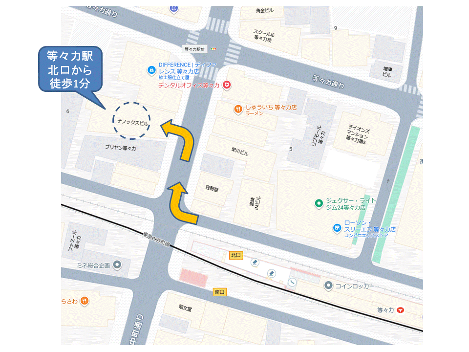 2. 最初の曲がり角を右折すると、通りを挟んだ向かい側に、NANOK’sビルが見えます。